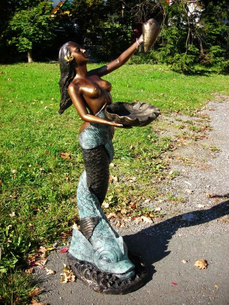 Die mehrfarbige Bronzeskulptur stellt die Synthese zwischen dem Fabelwesen Meerjungfrau und der Meerestierwelt ausdrucksvoll dar.