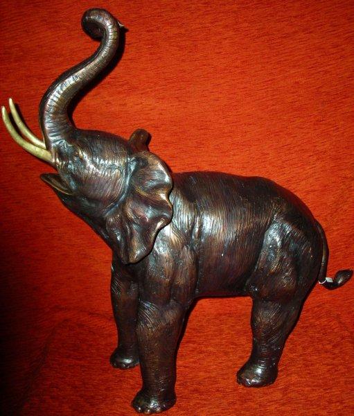 Bronze-Figur Stehender Glückselefant, Voller Freude hat der Elefant seinen Rüssel in die Luft geschwungen