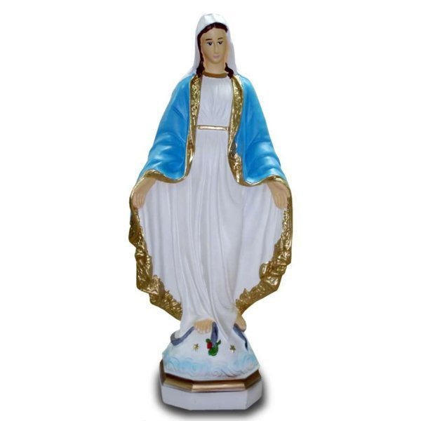 Die anmutige Maria hat segensreich ihre Arme ausgebreitet. Mit nackten Füßen steht sie auf einer Halbkugel, die mit goldenen Sternen das Himmelszelt symbolisiert.