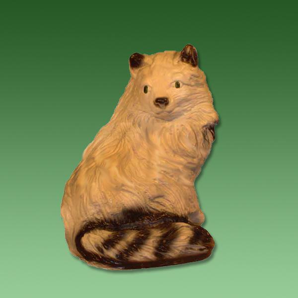 Freundlich schaut einem die sitzende, weiße Katze mit flauschigem Fell entgegen. Die Ohren sind dunkel gefärbt und der Schwanz ist gestreift.