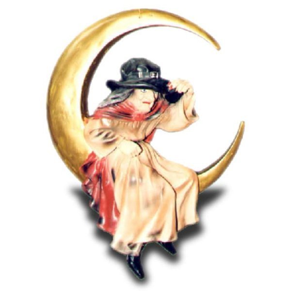 Die Hexe schaut grimmig nach vorne. Sie trägt ein langes Gewand und einen Hut. Diesen hält sie fest, um ihn nicht zu verlieren. Sie hat es sich in dem Halbmond bequem gemacht.