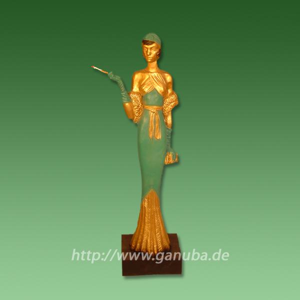 Die schlanke, elegante Dame ist glamourös im Stil der zwanziger Jahre gekleidet. Selbstbewusst trägt die Schönheit ihr türkis-goldenes Kleid, ihre türkisen Handschuhe und ihren türkisen Hut und ihr goldenes Handtäschchen. Um ihre Arme hat sie eine goldene Federboa geschlungen. Unter dem Hut schauen ihre kecke Bubikopf-Frisur heraus. Gratiös hält sie in der rechten Hand ihre Zigarette.