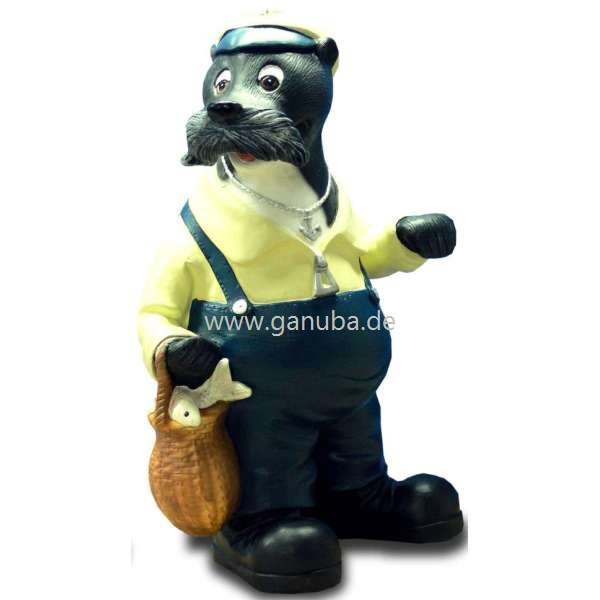 Der Seebär trägt eine Mütze und eine silberne Anker - Kette. Er war gerade auf dem Markt und hat seine Tasche mit frischen Fischen gefüllt.